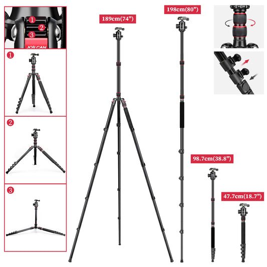 JOILCAN 74" Camera Tripod & Monopod, Aluminum Tripod with Metal Ball Head & Phone Holder, Travel Lightweight Tripod Stand for Canon/Nikon/Sony/DSLR Camera/Smartphone, Load Capacity 13.6kg/30lbs(EU)