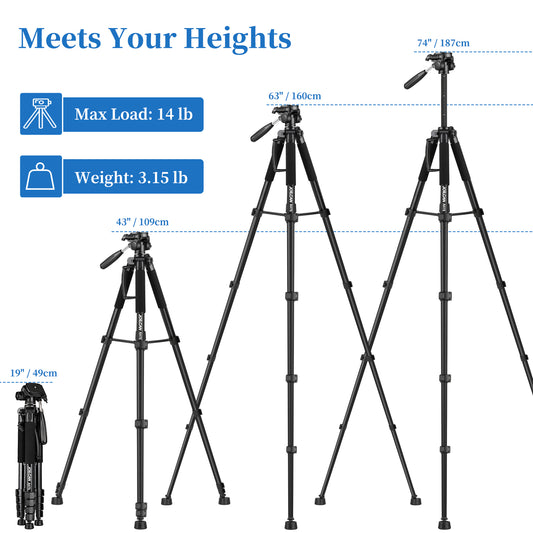 JOILCAN Camera Tripod for Canon Nikon, 74" Lightweight DSLR Tripod Camera Stand with Detachable Head and Universal Phone Mount, Reinforced Aluminum Tall Tripod for Vlog Live Streaming Max Load 14LB(EU)