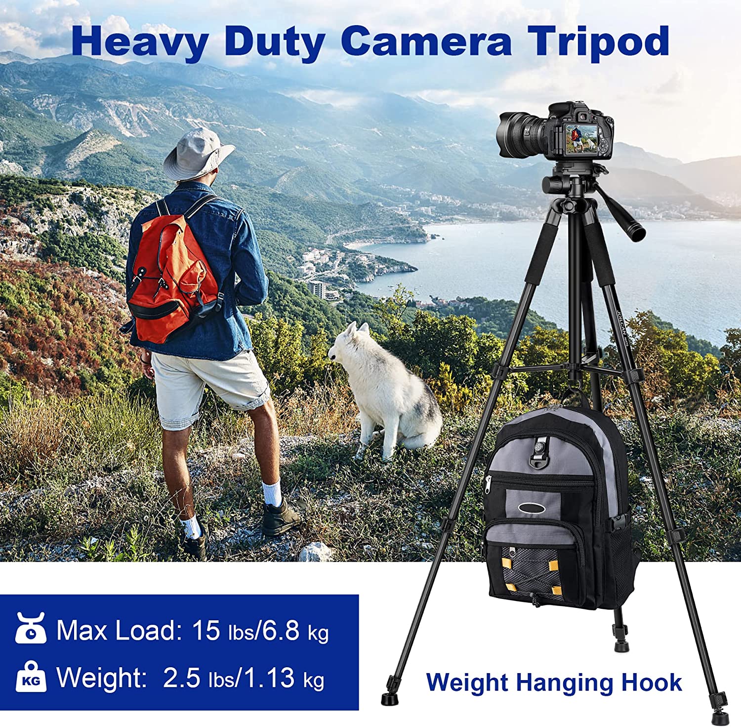【Heavy Duty Camera Tripod 】Camera tripod stand can hold up to 15 pounds and weighs 2.85 pounds. Made of aluminum alloy material, the thicker aluminum tripod's leg tube and load-bearing hook can make the tripod more stable. Non-slip rubber feet design, greater ground friction, more sturdy.