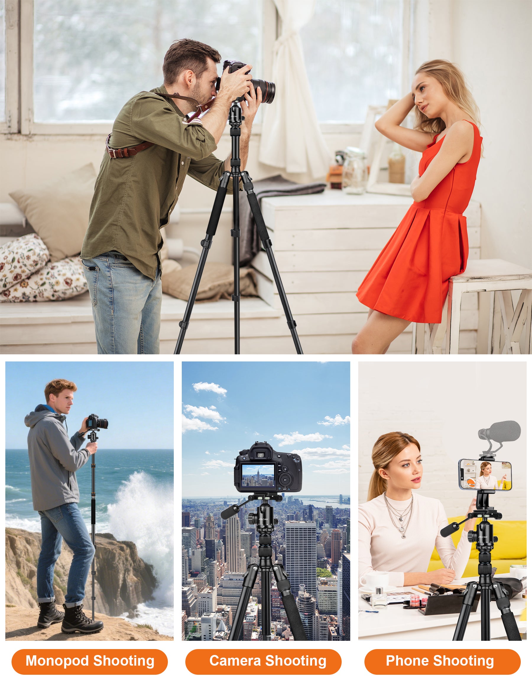Convert Tripod to Monopod -- Flexible and adjustable tripod is made of sturdy aluminum alloy and features a removable tripod leg that attaches to the center column, quickly transforming tripod into a monopod with adjustable heights from 31 to 83 inches. Sufficient stability and shooting height tripod for camera make it a versatile accessory for any image maker, providing an alternative way of shooting with ease. You can also use lightweight tripod as an alpenstock while hiking or walking.
