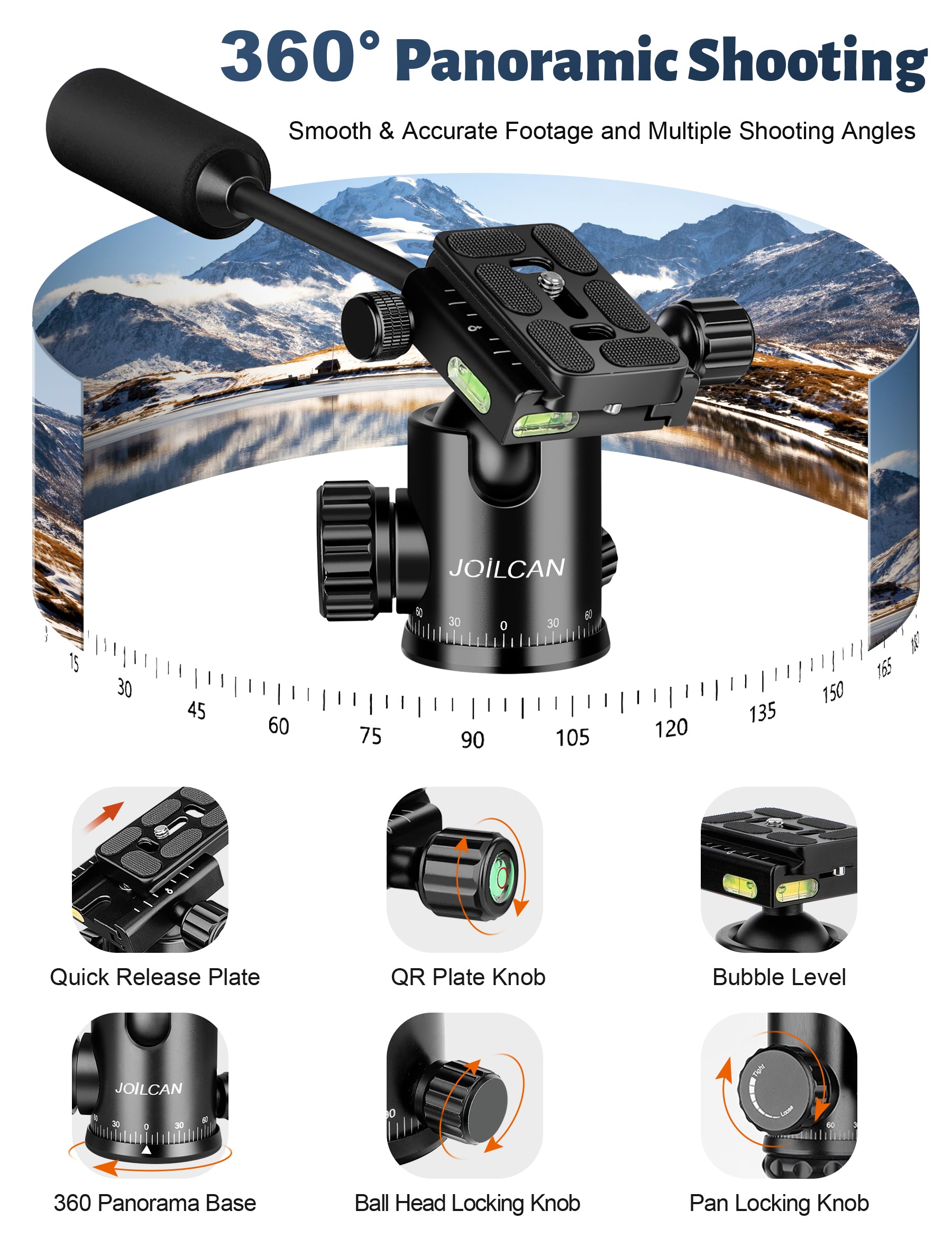 Ball Head with Detachable Handle-- Camera tripod head comes with a detachable metal handle for easy handling and horizontal rotation of the shot. 38mm aluminum ball head rotates 360 ° and tilts +90°/ -45° to give you the perfect shot every time. It has 2 independent control knobs for easy adjustment at every precise angle. 3 built-in bubble levels help achieve precise horizontal alignment at different shooting angles.