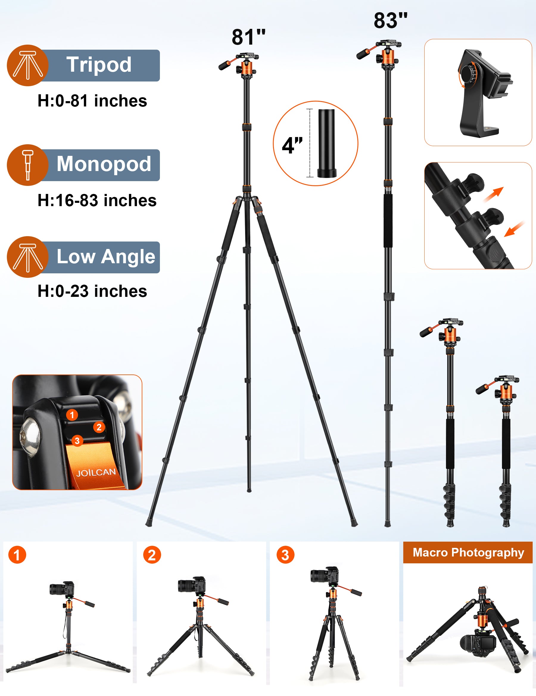 Convert Tripod to Monopod -- Flexible and adjustable tripod is made of sturdy aluminum alloy and features a removable tripod leg that attaches to the center column, quickly transforming tripod into a monopod with adjustable heights from 31 to 83 inches. Sufficient stability and shooting height tripod for camera make it a versatile accessory for any image maker, providing an alternative way of shooting with ease. You can also use lightweight tripod as an alpenstock while hiking or walking.
