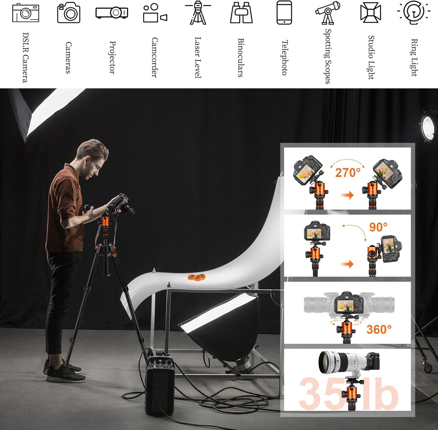 38 MM Panoramic Ball Head -- Tripod for Camera with 360° panning and +90°/ -70° tilt to get the perfect shot every time. 3 built-in bubble levels to accommodate landscape or portrait orientations, precise 360-degree scale realizes accurate image alignment